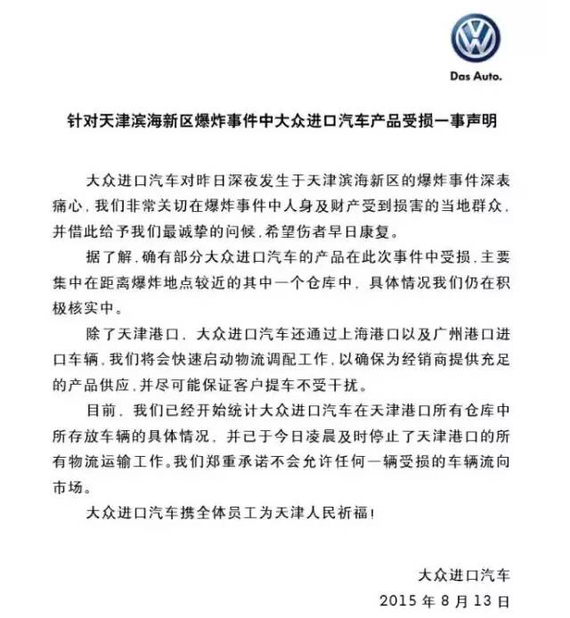 都说水火无情,天灾无可阻挡。不过对于消费者来说,我们非常关注那些受损车辆的最终走向。此前奥迪出现泡水车事件,最终选择公布所有车辆车架号,内部消化防止泡水车辆流入市场。那么对于此次天津塘沽爆炸的过火车辆,这些汽车厂商将会让受损车辆何去何从?修复之后继续售卖?目前受损失较大的大众及雷诺集团已经承诺声明不会将受损车辆流向市场。我们当然希望如此,并期盼此事件后厂商们的实际行动,并将所有受损车辆车架号公布于众。不知道是否会与奥迪相同公布受损车辆的车架号?我们将继续等待事件的后续进展。
