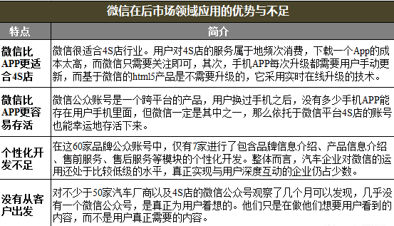 当越来越多的4S店意识到微信的重要性后,事情有了新的变化。有4S店已经在微信上开设公众账号,账号的后台进行了复杂的技术开发,可以一对一地为车主提供用车提醒(违章、保养、保险)、预约、在线服务、一键呼叫救援等业务。微信的出现使得4S店的客服效率大大提升,并减少了许多成本。