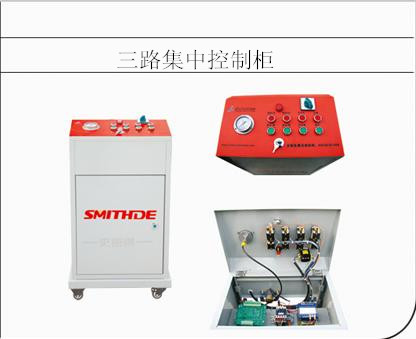 v 控制柜三个油路与底座上的油缸、平台两侧两路油路分别相连,分别供给两个塔柱独自拉伸,互无影响,无需人工转换,一根气管与保险锁齿上的汽缸相连,确保平台上下操作安全。