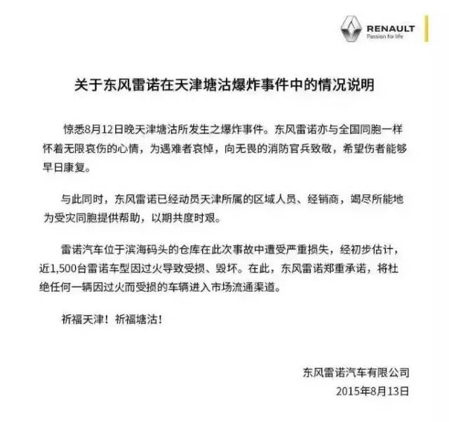 东风雷诺发布了一则官方说明,由于滨海码头的仓库在事故中严重损失,1500辆左右雷诺车型因过火导致受损,毁坏……1500台,这又是多少钱?!