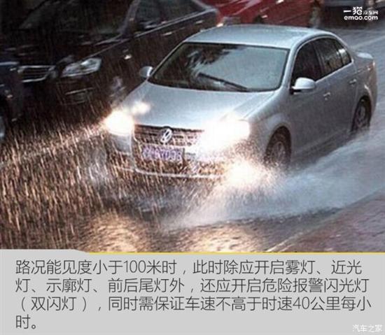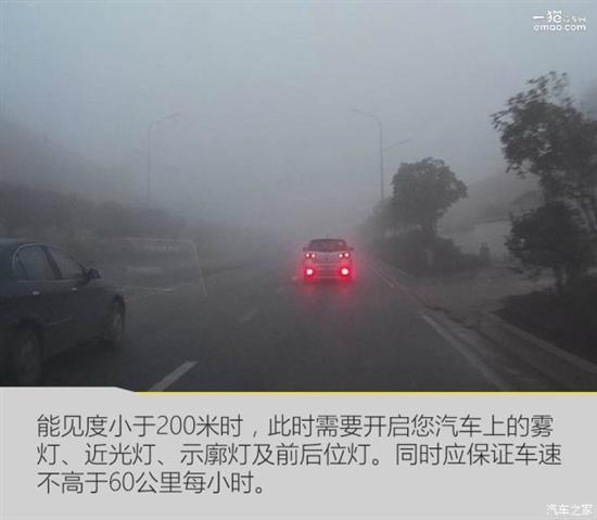当行车过程中遭遇小雨、小雪、薄雾,能见度小于200米时,此时需要开启您汽车上的雾灯、近光灯、示廓灯及前后位灯。同时应保证车速不高于60公里每小时。