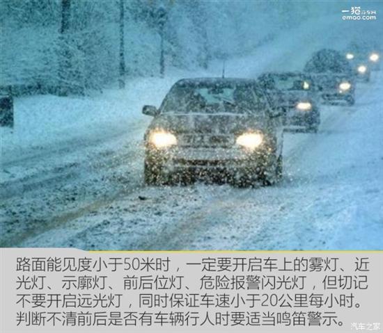 当行车过程中遭遇重度降雨、降雪、大雾,路面能见度已小于50米时,此时最安全的做法就是尽量不要行车,但如果条件不允许(如此时正在高速公路上或附近没有停车条件等),那一定要开启车上的雾灯、近光灯、示廓灯、前后位灯、危险报警闪光灯等基本可以开启的所有灯光,但切记不要开启远光灯。同时驾驶人应保证车速小于20公里每小时,在判断不清前后是否有车辆行人时要适当鸣笛,起到警示作用。
