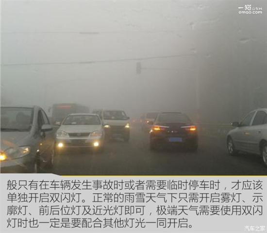 许多司机在雨雪雾天气下习惯只开启汽车的双闪灯,而不开其它灯光,这种做法是错误并危险的,一般只有在车辆发生事故时或者需要临时停车时,才应该单独开启双闪灯。正常的雨雪天气下只需开启雾灯、示廓灯、前后位灯及近光灯即可,极端天气需要使用双闪灯时也一定是要配合其他灯光一同开启。否则一是其在雨雪雾天的警示作用没有那么强,二是容易让前后方车辆误会驾驶人意图,造成安全隐患。