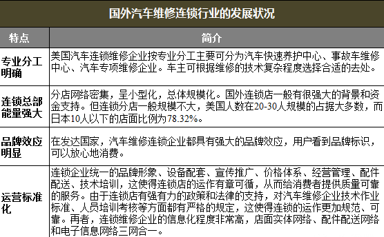 汽车维修企业连锁经营模式在发达国家方兴未艾,逐步成为汽车维修企业的主体力量之一。