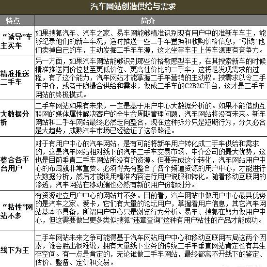 国内二手车价格相比国外仍然偏高,供不应求是主因。正因为供不应求,几乎所有二手车网站都盯着车源不放,谁的车源多,谁的车源信息准确,谁就能从二手车中介公司那里获得收入。从需求看,消费者仍然对二手车消费不信任,宁可高价买新车,也无法接受更具性价比的二手车。 如果能借助互联网说服老旧车型的所有者卖旧车,如果能说服打算买廉价新车的车主买更具性价比的二手车,这是现有汽车网站大有可为的地方。