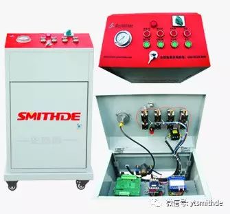v 控制柜三个油路与底座上的油缸、平台两侧两路油路分别相连,分别供给两个塔柱独自拉伸,互无影响,无需人工转换,一根气管与保险锁齿上的汽缸相连,确保平台上下操作安全。
