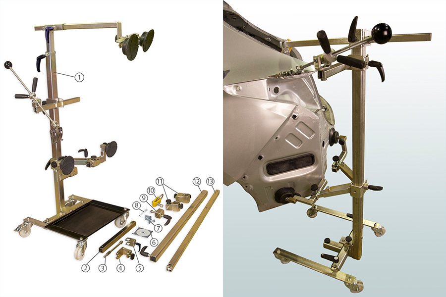 研制智能修复设备过程中,以上这些反馈信息都得到了充分的重视,并以此加以改进。也就是说,新的工具不但没有先前拉拔器的缺憾,而且还增加了车轮移动功能,使垂直的推拉螺柱便捷地上下和左右进行调节以达到要求校正的位置上。这样,校正作业也就无障碍地能自如进行了。
