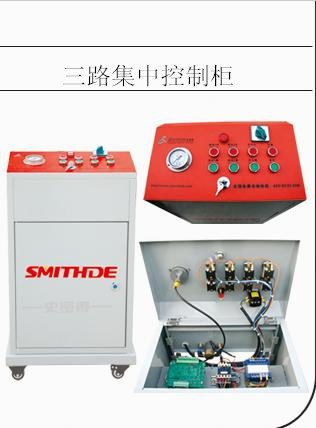 v 控制柜三个油路与底座上的油缸、平台两侧两路油路分别相连,分别供给两个塔柱独自拉伸,互无影响,无需人工转换,一根气管与保险锁齿上的汽缸相连,确保平台上下操作安全。